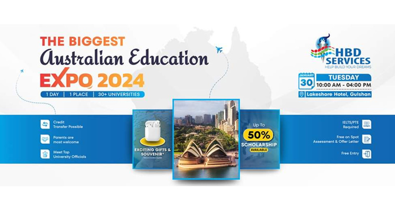 জানা যায়, অস্ট্রেলিয়ার শীর্ষস্থানীয় ৩৫টির বেশি বিশ্ববিদ্যালয়ের অংশগ্রহণে ঢাকায় হতে যাচ্ছে ‘অস্ট্রেলিয়া এডুকেশন এক্সপো ২০২৪। ওই দিন সকাল ১০টা থেকে বিকেল ৫টা পর্যন্ত এই এক্সপো চলবে। মেলায় অংশগ্রহণকারী অস্ট্রেলিয়ান বিশ্ববিদ্যালয়গুলোর প্রতিনিধিরা জানাবেন অস্ট্রেলিয়ায় উচ্চশিক্ষার সুযোগ-সুবিধা, আবেদন প্রক্রিয়া, খরচ, স্কলারশিপ ও চাকরির সুযোগ সম্পর্কে।
