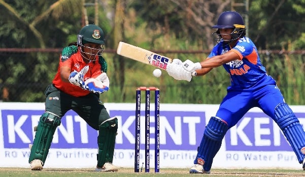রানের খাতা খুলতে না পারা মিন্নু মানিকে ফেরান ফারজানা ইয়াসমিন। রাধা যাদব ও তেজাল হাসাবনিস বেশ বড় জুটি গড়েন। ৩০ বলে ৩৬ রান করা রাধাকে ফেরান অধিনায়ক ফাহিমা। ভারতকে একা টেনে নেন তেজাল, ৩৪ বলে করেন অপরাজিত ৫১ রান।
