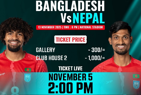 নেপাল-বাংলাদেশ ম্যাচের জন্য বুধবার দুপুর ২টা থেকে টিকিট বিক্রি শুরু হবে। টিকিট পাওয়া যাবে QUICKET এর ওয়েবসাইটে।