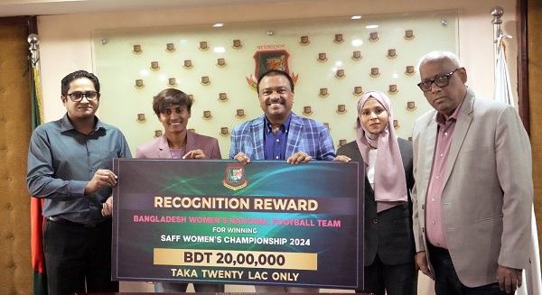 নেপালকে হারিয়ে টানা দ্বিতীয়বার নারী সাফ চ্যাম্পিয়নশিপের শিরোপা জয় করেছে বাংলাদেশ জাতীয় ফুটবল দল। ঘোষণা অনুযায়ী বুধবার পুরস্কারের চেক অধিনায়ক সাবিনা খাতুনের হাতে বুঝিয়ে দিলেন বিসিবি সভাপতি ফারুক আহমেদ।