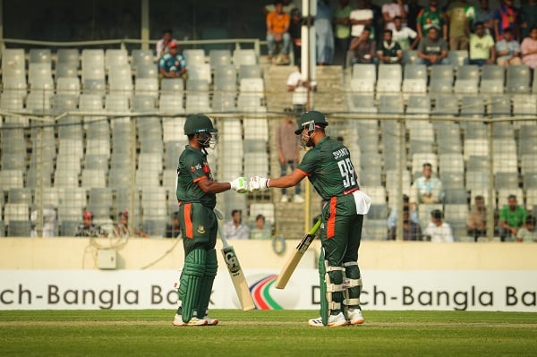 রানতাড়ায় শুরুটা ভালো হয়নি বাংলাদেশের। প্রথম ওভারের শেষ বলে ৮ রানে আউট হন সাইফ হাসান। ২১ রানে দ্বিতীয় উইকেট হারায় টিম টাইগার্স। ১১ বলে ৮ রান করে ফেরেন সৌম্য সরকার। তৃতীয় উইকেটে ১২০ রানের জুটি গড়েন নাজমুল হোসেন শান্ত ও তানজিদ তামিম।