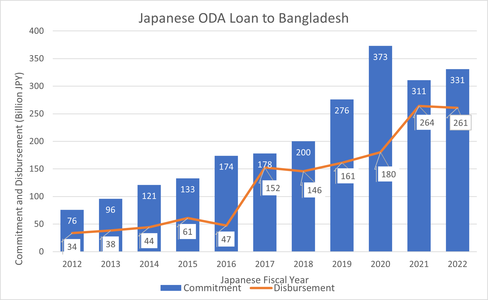 জাইকা ২০২০ জাপান অর্থবছরে বাংলাদেশে ৩৭৩ বিলিয়ন জাপানি ইয়েন অর্থায়নের প্রতিশ্রুতি দেয়, যা স্থানীয় পর্যায়ে সংস্থাটির ইতিহাসে সর্বোচ্চ অঙ্কের ঋণ প্রতিশ্রুতি ছিল। ২০২২ জাপান অর্থবছরে জাইকা’র মোট বিতরণের পরিমাণ ছিল ২৬১ বিলিয়ন জাপানি ইয়েন, যা এর আগের, অর্থাৎ ২০২১ অর্থবছরের ২৬৪ বিলিয়ন জাপানি ইয়েনের রেকর্ডের চেয়ে সামান্য কম।