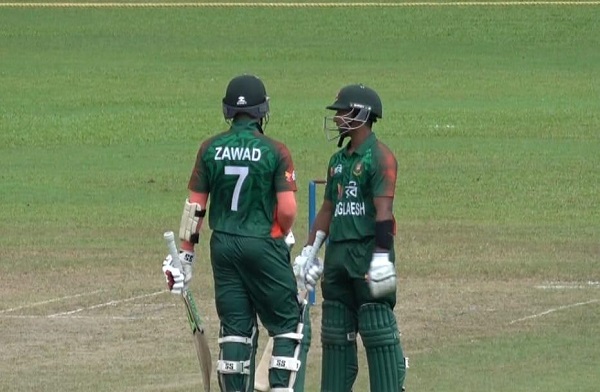 ব্যাটে নেমে বাংলাদেশের জাওয়াদ আবরার ফেরেন ১৯ রান করে। দলীয় রান তখন ২৯। কালাম সিদ্দিকি আর অধিনায়ক আজিজুল হক তামিমের জুটি যোগ করে ৪৫ রান। তামিম ফেরেন ব্যক্তিগত ২৪ রানে। দলীয় রান তখন ৭৪। সেখানেই শুরু বিপর্যয়ের। এরপর বাংলাদেশের যুবাদের আর কেউই খেলতে পারেননি বড় ইনিংস।