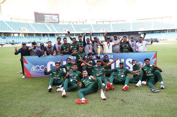 দুবাই আন্তর্জাতিক ক্রিকেট স্টেডিয়ামে রোববার ফাইনালে ব্যাটে খুব একটা আলো ছড়াতে পারেনি বাংলাদেশ। দুইশ’র আগে থেমেছিল। বল হাতে দারুণ করেছেন আজিজুল হাকিম তামিম ও ইকবাল হোসেন ইমনরা। দাপুটে বোলিংয়ে ভারতকে ৫৯ রানে হারিয়ে টানা দ্বিতীয়বার চ্যাম্পিয়ন হয়েছে বাংলাদেশ। ২০২৩ আসরে সংযুক্ত আরব আমিরাতকে হারিয়ে শিরোপা জিতেছিল যুবা টিম টাইগার্স।