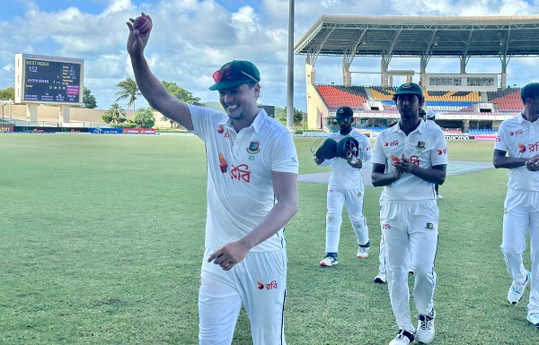 অ্যান্টিগায় স্যার ভিভিয়ান রিচার্ডস স্টেডিয়ামে টসে জিতে আগে বল করার সিদ্ধান্ত নিয়েছিলেন সফরকারী অধিনায়ক মেহেদী হাসান মিরাজ। জাস্টিন গ্রেভসের সেঞ্চুরি (১১৫) ও মিকাইলে লুইসের (৯৭) ও অ্যালিক অ্যাথানজের (৯০) দৃঢ়তায় প্রথম ইনিংসে সাড়ে চারশ রানে যায় স্বাগতিক দল। বাংলাদেশের পেসার হাসান মাহমুদ ৩টি এবং তাসকিন আহমেদ ও মেহেদী হাসান মিরাজ নেন ২টি করে উইকেট।
