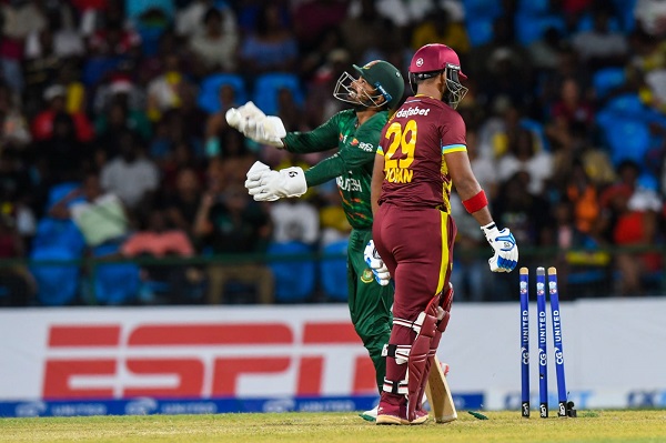 তাসকিনের পর আঘাত হানলেন মেহেদী। অফস্পিনের মুখে এগিয়ে এসে মারতে গিয়ে স্টাম্পড হন নিকোলাস পুরান। আউট হন ১ রান করে
