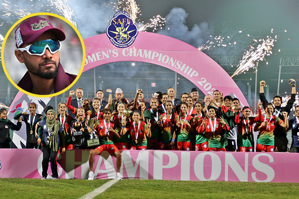 টানা দ্বিতীয়বার মেয়েদের সাফ শিরোপা জিতেছে বাংলাদেশ। মনিকা চাকমা ও ঋতুপর্ণা চাকমার গোলে স্বাগতিক নেপালকে ২-১এ হারিয়েছে সাবিনা খাতুনের দল। মেয়েদের এমন সাফল্যে অভিনন্দন জানিয়েছেন বাংলাদেশ জাতীয় ক্রিকেট দলের সাবেক অধিনায়ক মাশরাফী বিন মোর্ত্তজা।