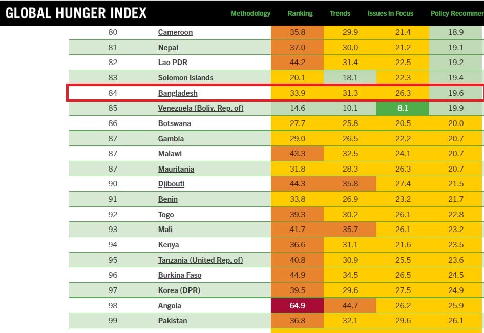 বিশ্ব ক্ষুধা সূচকে (Global Hunger Index 2022) অপেক্ষাকৃত ভাল অবস্থানে রয়েছে বাংলাদেশ। মোট ১২১টি দেশের তালিকায় বাংলাদেশ ১৯.৬ পয়েন্ট নিয়ে ৮৪ তম স্থানে রয়েছে। সাধারণত ২০ পয়েন্টের এর নীচে অবস্থানকারী দেশগুলোকে মোটামুটি নিরাপদ বলে ধরা হয়ে থাকে।