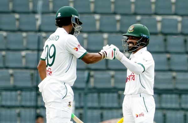 দিনের শুরুটা সাদমান ইসলাম ও মাহমুদুল হাসান জয় দেখেশুনে করেছিলেন। ৩২ রানে দুই ব্যাটারকে ফেরান ভিক্টর নিয়াউচি। পরে শান্ত ও মুমিনুল মিলে যোগ করেন ৬৬ রান। ৯৮ রানে শান্ত ফিরে গেলে জুটি ভাঙে। ৬৯ বলে ৪০ রান করেন বাংলাদেশ অধিনায়ক।