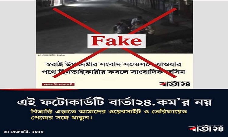 ‘স্বরাষ্ট্র উপদেষ্টার সংবাদ সম্মেলনে যাওয়ার পথে ছিনতাইকারীর কবলে সাংবাদিক জসিম’ শিরোনামে বেসরকারি অনলাইন সংবাদ মাধ্যম বার্তা২৪ ডট কম এর লোগো ও ডিজাইন ব্যবহার করা একটি ফটোকার্ড ছড়িয়ে পড়েছে সামাজিক যোগাযোগ মাধ্যম ফেসবুকে। এবার সেই ফটোকার্ড ভুয়া উল্লেখ করে বার্তা দিয়েছে সংবাদ মাধ্যমটি।