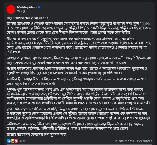 উপদেষ্টা মাহফুজ আলম লিখেছেন, আমরা আঞ্চলিক ও বৈশ্বিক আধিপত্যবাদ মোকাবিলা করছি। নিছক কিছু মূর্তি বা দালান নয়। মূর্তি (idols) না ভেঙে আমাদের উচিত আমাদের শত্রুদের শক্তির বিপরীতে পাল্টা চিন্তা (Ideals), শক্তি ও হেজেমনি গড়ে তোলা। ভাঙার প্রকল্প থেকে সরে এসে দিনকে দিন আমাদের গড়ার প্রকল্প হাতে নেওয়া উচিত।