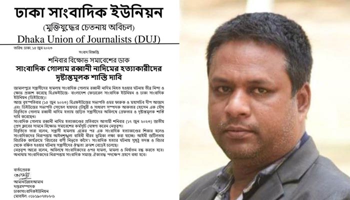 বৃহস্পতিবার ১৫ জুন বিএফইউজের সভাপতি ওমর ফারুক ও মহাসচিব দীপ আজাদ এবং ডিইউজের সভাপতি সোহেল হায়দার চৌধুরী ও সাধারণ সম্পাদক আকতার হোসেন এক যৌথ বিবৃতিতে গোলাম রব্বানী নাদিম হত্যায় জড়িত সন্ত্রাসীদের অবিলম্বে গ্রেপ্তার ও দৃষ্টান্তমূলক শাস্তি দাবি করেছেন।