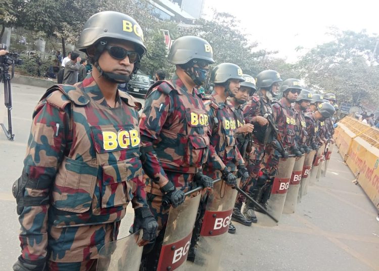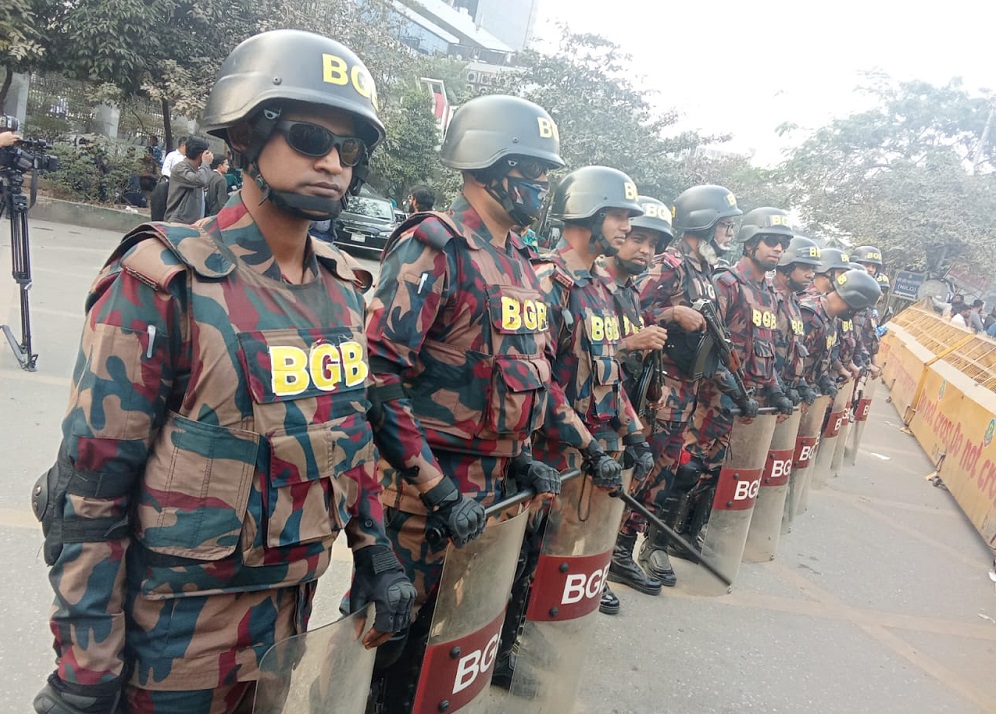 আইনশৃঙ্খলা পরিস্থিতি স্বাভাবিক রাখতে রাজধানীর আগারগাঁওয়ে নির্বাচন কমিশন—ইসি ভবনের সামনে বর্ডার গার্ড বাংলাদেশ (বিজিবি) মোতায়েন করা হয়েছে।
