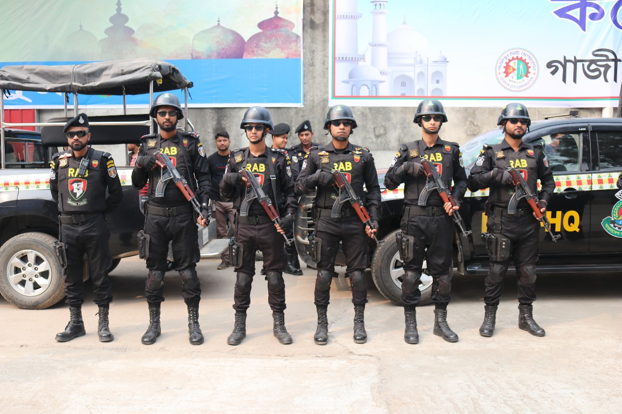 বিশ্ব ইজতেমা ২০২৪ উপলক্ষে ইজতেমা মাঠসহ আশেপাশের এলাকায় যে কোন অপ্রীতিকর পরিস্থিতি মোকাবেলায় প্রস্তুত রয়েছে র্যাব। সংস্থাটির ৫টি ব্যাটালিয়নের (১, ২, ৩, ৪ ও ১০) এর সমন্বয়ে আকাশপথে র্যাবের হেলিকপ্টার টহল, ডগ স্কোয়াড টিম, ফুট পেট্রোলিং, মোবাইল টিম, টহল টিম, সাইবার মনিটরিং সহ ৭ স্তরের নিরাপত্তা ব্যবস্থা থাকছে এবার বিশ্ব ইজতেমায়।
