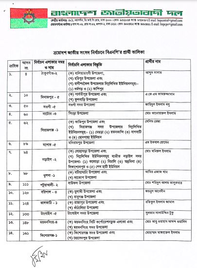 আসনগুলো হলো- ঠাকুরগাঁও-২ আসনে আব্দুস সালাম, দিনাজপুর-৫ আসনে এ কে এম কামরুজ্জামান, নওগাঁ-৫ আসনে জাহিদুল ইসলাম ধলু, নাটোর-৩ আসনে মো. আনোয়ারুল ইসলাম, সিরাজগঞ্জ-১ আসনে সেলিম রেজা, যশোর-৫ আসনে এম ইকবাল হোসেন, নড়াইল-২ আসনে মো. মনিরুল ইসলাম, খুলনা-১ আসনে আমির এজাজ খান, পটুয়াখালী-২ আসনে মো. শহিদুল আলম তালুকদার, বরিশাল-৩ আসনে জয়নুল আবেদীন, ঝালকাঠি-১ আসনে রফিকুল ইসলাম জামাল।