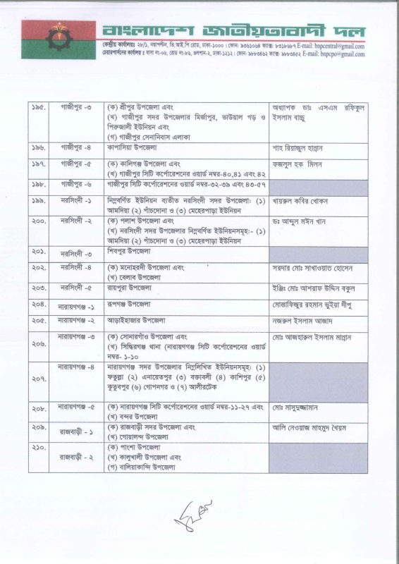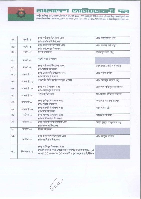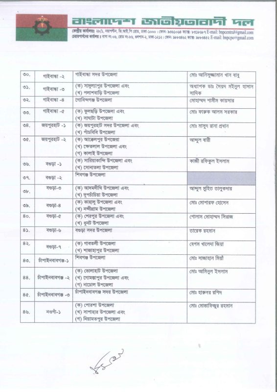 আসন্ন জাতীয় সংসদ নির্বাচনে সম্ভাব্য প্রার্থীর নাম ঘোষণা করছে বিএনপি। আজ সোমবার বিকেলে গুলশানে বিএনপি চেয়ারপারসনের কার্যালয়ে অনুষ্ঠিত বৈঠক শেষে সংবাদ ব্রিফিংয়ে দলের মহাসচিব মির্জা ফখরুল ইসলাম আলমগীর ২৩৭টি আসনে নাম ঘোষণা করেন।