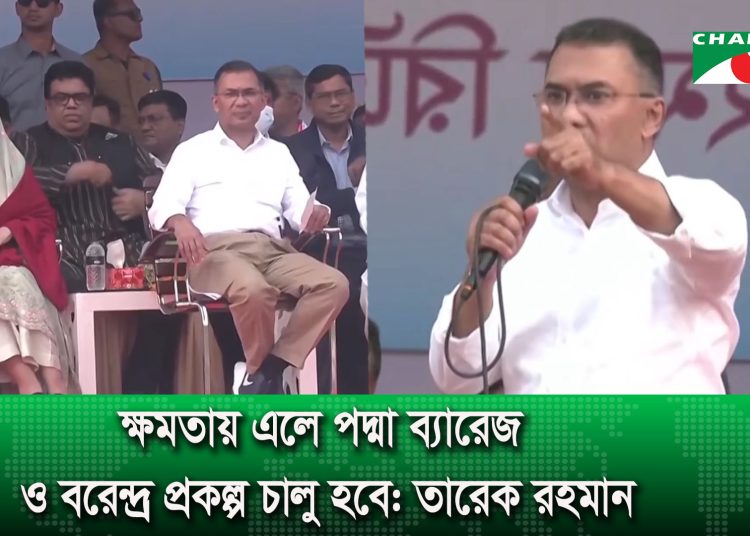 বিএনপি চেয়ারম্যান তারেক রহমান বলেছেন, নির্বাচনে জনগণের সমর্থন পেয়ে ধানের শীষ ক্ষমতায় আসলে পদ্মা ব্যারেজ নির্মাণ ও বরেন্দ্র প্রকল্পের কাজ চালু করা হবে। রাজশাহীর ঐতিহাসিক মাদ্রাসা মাঠের জনসভায় তিনি আরও বলেন, কৃষকদের জন্য সুদসহ দশহাজার টাকা পর্যন্ত কৃষিঋণ মওকুফ করবে বিএনপি। একটি মহল নির্বাচনকে বানচালের ষড়যন্ত্র করছে। ১২ই ফেব্রুয়ারির নির্বাচন কেউ যাতে বানচাল করতে না পারে সেজন্য সবাইকে সজাগ থাকার আহ্বান জানান তারেক রহমান। রাজশাহী থেকে জয় দেবের ভিডিওচিত্রে বিস্তারিত জানাচ্ছেন মইনুল হাসান।