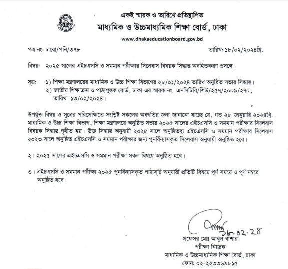বিজ্ঞপ্তিতে জানানো হয়, সিদ্ধান্ত অনুযায়ী ২০২৫ সালে অনুষ্ঠিতব্য এইচএসসি ও সমমান পরীক্ষার সিলেবাস ২০২৩ সালে অনুষ্ঠিত এইচএসসি ও সমমান পরীক্ষার জন্য পুনর্বিন্যাসকৃত সিলেবাস অনুযায়ী অনুষ্ঠিত হবে। অর্থাৎ, ২০২৩ সালে যে সিলেবাসে পরীক্ষা হয়েছে, সেই সিলেবাস অনুযায়ী পরীক্ষা আয়োজনের নির্দেশনা দেওয়া হয়েছে বোর্ড থেকে।