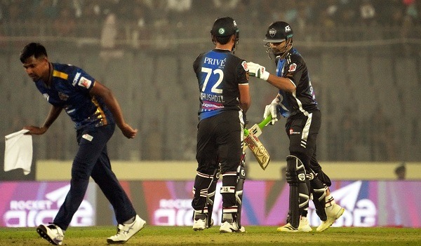 এক ওভার পর লিটন ফিরে যান ২৭ বলে ৩১ রান করে। তার ইনিংসে ছিল তিনটি চার ও একটি ছক্কার মার। পরে ধস নামে ঢাকার ইনিংসে। শেষপর্যন্ত ৯ উইকেটে ১৫১ রানে থামে তারা। ঢাকার হয়ে দুঅঙ্কের ঘরে পৌঁছেছেন স্টিপেন এসকেনজি (১৭), থিসারা পেরেরা (১৭), মুকিদুল ইসলাম (১৮) এবং নাজমুল হোসেন অপু ১২ রান।