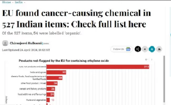 ইউরোপিয়ান ফুড সেফটি অথরিটি এক প্রতিবেদনে জানিয়েছে, তারা ভারত থেকে রপ্তানি করা ৫২৭ খাদ্যপণ্যে ক্যান্সার সৃষ্টিকারী উপাদানের উপস্থিতি চিহ্নিত করেছে।