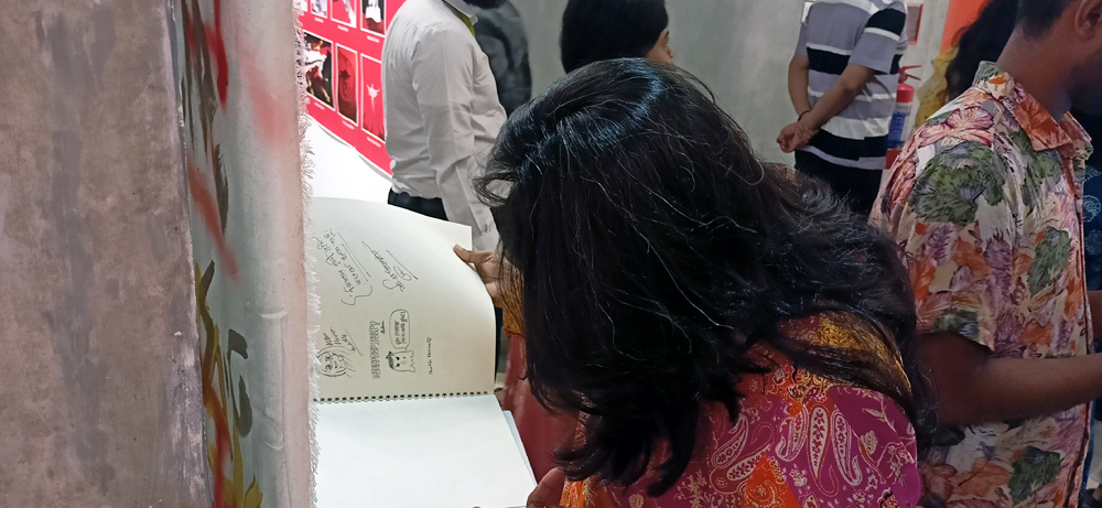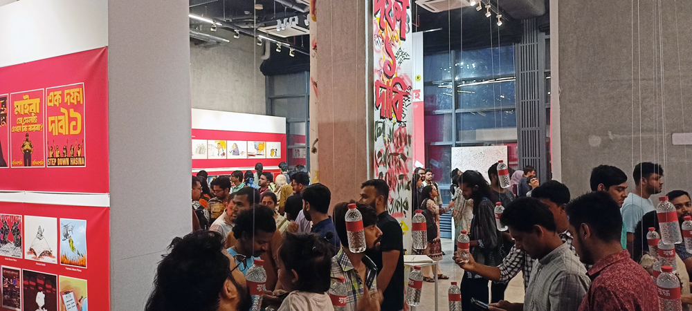 কার্টুনের সংস্কৃতি প্রায় হারিয়েই গিয়েছিলো। এবারের আন্দোলনের মধ্য দিয়ে আবার সেই চর্চা বেগবান হলো বলে মনে করেন আয়োজকরাঝুলন্ত পানির বোতলে লেখা ছিল শহীদ মুগ্ধর নাম, ছিল এই পথপরিক্রমা নিয়ে ভিডিওএই আন্দোলনে জনগণের সাথে কার্টুনিস্টদের সম্পর্ক তৈরী হয়েছে বলে মনে করেন আয়োজকরাঝুলন্ত পানির বোতলে লেখা ছিল শহীদ মুগ্ধর নাম। যা দর্শনার্থীদের বেশী আকর্ষণ করেপ্রদর্শনীতে রাখা হয়েছে মন্তব্য খাতাও। যেখানে মন খুলে লিখে যাচ্ছেন দর্শনার্থীরাসব বয়সীদের মিলনমেলায় পরিণত হয়েছে দৃক গ্যালারিকার্টুন ছাড়াও ছিল ইনস্টলেশন আর্টদুপুর ৩টা থেকে রাত ৮টা পর্যন্ত দেখা যাচ্ছে ‘কার্টুনে বিদ্রোহ’ প্রদর্শনীটি