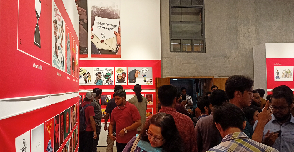 বাংলাদেশ কার্টুনিস্ট অ্যাসোসিয়েশন, দৃক ও ইয়ার্কির আয়োজনে ‘কার্টুনে বিদ্রোহ’ প্রদর্শনীটি শুরু হয়েছে গেল শুক্রবার। চলবে আগামি শুক্রবার পর্যন্ত। ছবিতে দেখে নেয়া যাক গ্যালারির অন্দরে রবিবার সন্ধ্যায় কেমন ছিলো দর্শক উপস্থিতি-