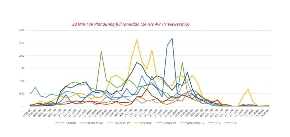 গ্রস রেটিং পয়েন্ট (জিআরপি)-এর গ্রাফ বিশ্লেষণে দেখা যায়, ইফতারের সময় প্রচারিত জনপ্রিয় অনুষ্ঠানগুলো—বিশিষ্ট রন্ধনশিল্পী কেকা ফেরদৌসীর ‘ভিম মনোহর ইফতার’ এবং ধর্মীয় অনুষ্ঠান ‘কাফেলা’ দর্শক চাহিদার দিক থেকে অন্যান্য চ্যানেলকে ছাড়িয়ে গেছে। এই সময়ের অনুষ্ঠানগুলো নিয়মিতভাবেই বিপুল দর্শক আকর্ষণ করতে সক্ষম হয়েছে।