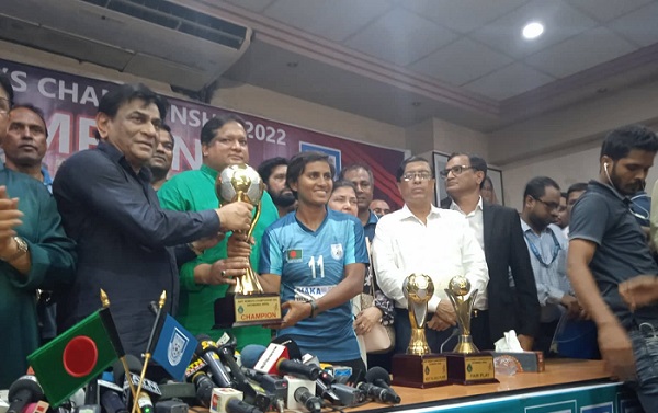 এর আগে বুধবার সন্ধ্যা সাড়ে ৭টায় ছাদখোলা বাসে বিমানবন্দর থেকে রাজসিক যাত্রা শেষে বাফুফে ভবনে পৌঁছান চ্যাম্পিয়নরা। দেশের ফুটবলের সর্বোচ্চ সংস্থাটির ভবনে পৌঁছাতে কৃষ্ণা-সাবিনাদের লেগেছে চার ঘণ্টারও বেশি। দীর্ঘ যাত্রায় ছিল না ক্লান্তির ছাপ। হাসিমুখে ট্রফি নিয়ে সাবিনা-মারিয়ারা বাফুফে কার্যালয়ে ঢুকেছেন সমর্থকদের ভালোবাসায় সিক্ত হয়ে।
