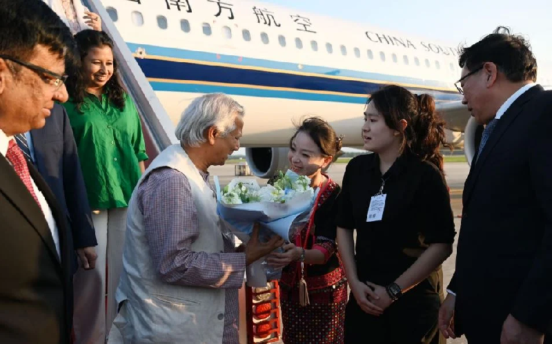 বেইজিংয়ে বাংলাদেশের রাষ্ট্রদূত মো. নাজমুল ইসলাম এবং হাইনান প্রদেশের ভাইস গভর্নর বিমানবন্দরে প্রধান উপদেষ্টাকে অভ্যর্থনা জানান।
