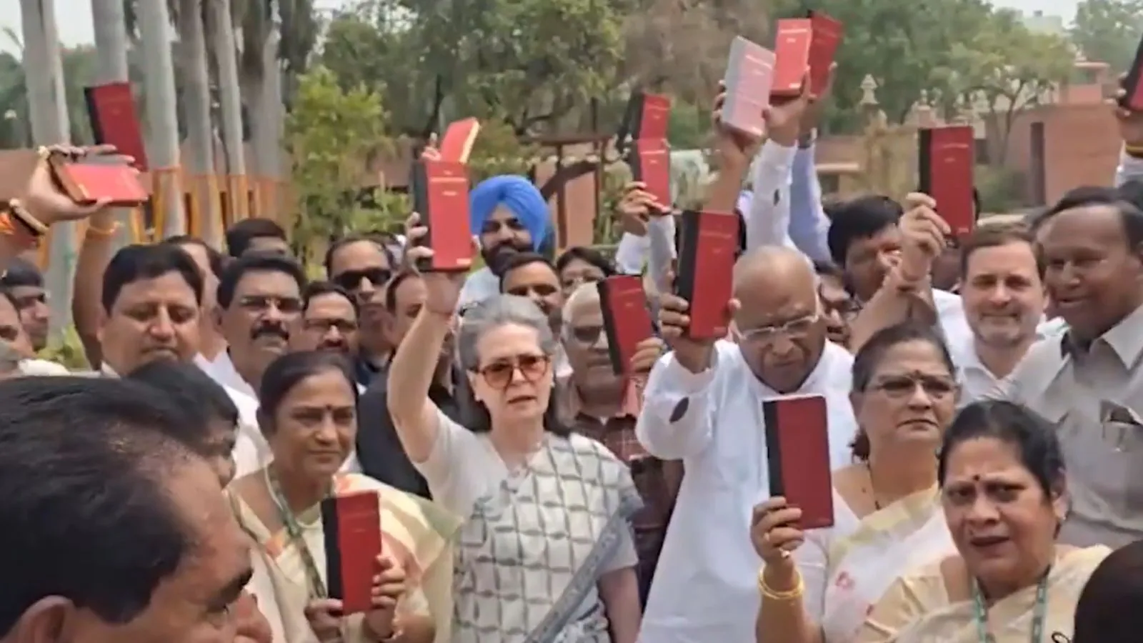 হিন্দুস্তান টাইমস জানিয়েছে, লোকসভার প্রথম অধিবেশনের দিনই সংবিধান বাঁচানোর দাবি তুলে সোনিয়া গান্ধী, মল্লিকার্জুন খড়্গে, সমাজবাদী পার্টির ডিম্পল যাদব, তৃণমূলের সুদীপ বন্দ্যোপাধ্যায়, সৌগত রায়, এনসিপি (এসসিপি)-র সুপ্রিয়া সুলেসহ বিরোধী সাংসদরা হাতে সংবিধান নিয়ে বিক্ষোভ দেখান।