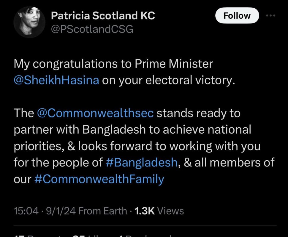 প্যাট্রিসিয়া স্কটল্যান্ড কেসি সামাজিক যোগাযোগ মাধ্যম এক্স-এ (টুইটার) দেওয়া একটি পোস্টে বলেছেন, প্রধানমন্ত্রী শেখ হাসিনাকে তার নির্বাচনী বিজয়ের জন্য আমার অভিনন্দন।
