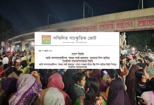 কোটা আন্দোলনকারীদের “আমরা সবাই রাজাকার” স্লোগান দেওয়ার ঘটনায় তীব্র নিন্দা জানিয়েছে সাংস্কৃতিক ফেডারেশনসমূহ। মঙ্গলবার ১৬ জুলাই এক বিবৃতিতে এই কথা বলা হয়েছে।