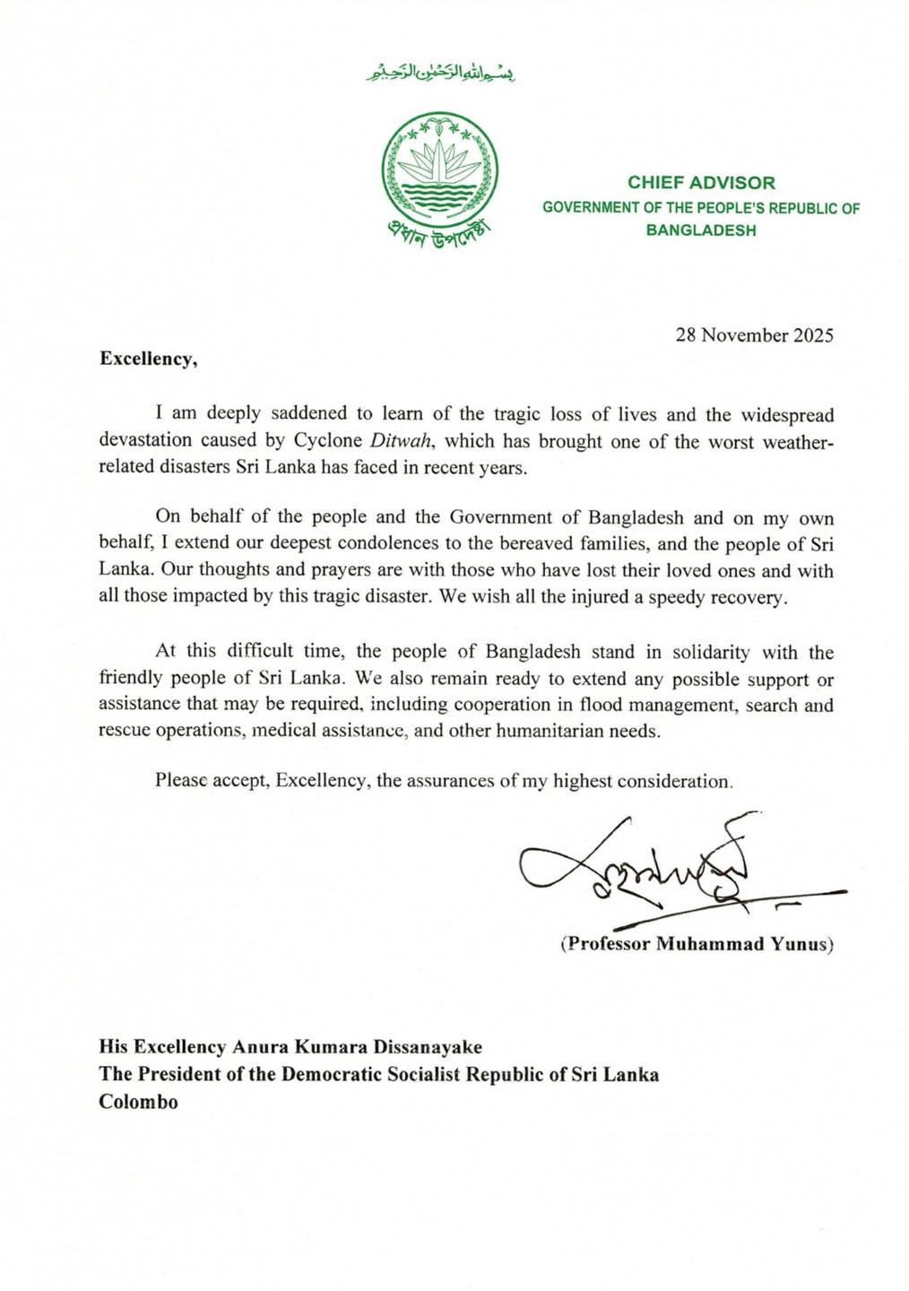 বাংলাদেশ সরকারের প্রধান উপদেষ্টা প্রফেসর মুহাম্মদ ইউনূস শ্রীলঙ্কার প্রেসিডেন্ট অনুরা কুমার দিসানায়েকের কাছে ঘূর্ণিঝড় ডিটওয়াহ-এর কারণে সৃষ্ট প্রাণহানি ও ব্যাপক ধ্বংসযজ্ঞের ঘটনায় গভীর সমবেদনা জ্ঞাপন করেছেন। প্রয়োজনে বাংলাদেশ সরকারের পক্ষ থেকে সব ধরনের সহায়তার আশ্বাসও দিয়েছেন তিনি।