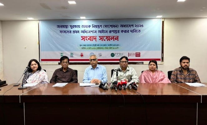 আজ মঙ্গলবার জাতীয় প্রেস ক্লাবের জহুর হোসেন চৌধুরী হলে আয়োজিত ‘জনস্বাস্থ্য সুরক্ষায় তামাক নিয়ন্ত্রণ (সংশোধন) অধ্যাদেশ ২০২৫ সংসদের প্রথম অধিবেশনে আইনে রূপান্তর করার দাবি’ শীর্ষক এক সংবাদ সম্মেলনে বক্তারা বলেন, সংসদের প্রথম অধিবেশনে উপস্থাপনের ৩০ দিনের মধ্যে অধ্যাদেশটি পাস না হলে এর কার্যকারিতা হারাবে।