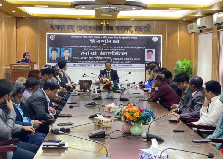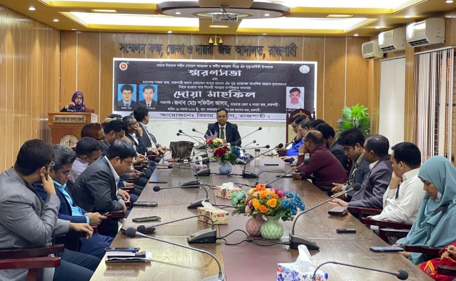 গতকাল (১৬ নভেম্বর) রাজশাহী বিচার বিভাগের উদ্যোগে জেলা জজ আদালত ভবনের সম্মেলন কক্ষে ২০০৫ সালে জঙ্গি হামলায় নিহত প্রয়াত বিচারক শহীদ সোহেল আহমেদ ও জগন্নাথ পাঁড়ে-এর মৃত্যুবার্ষিকী উপলক্ষে স্মরণসভা এবং সম্প্রতি দুর্বৃত্তের হামলায় রাজশাহীর মহানগর দায়রা জজ মোহাম্মদ আব্দুর রহমানের ছেলে মোহাম্মদ তাওসিফ রহমান নৃশংসভাবে খুন হওয়ায় তার বিদেহী আত্মার মাগফিরাত কামনায় দোয়া মাহফিল অনুষ্ঠিত হয়। এই অনুষ্ঠানে বিচারকদের বক্তব্যে এ দাবি উঠে আসে।