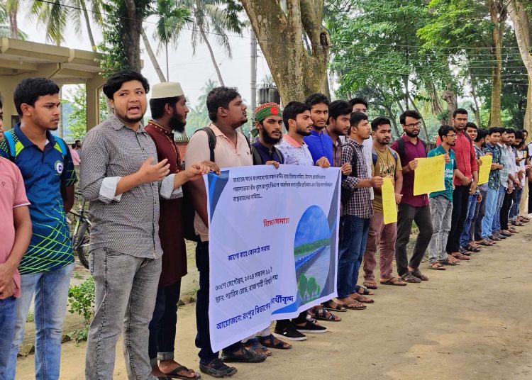ভারতের সঙ্গে বাংলাদেশের আন্তর্জাতিক নদীর পানির ন্যায্য হিস্যা ও তিস্তা মহাপরিকল্পনা বাস্তবায়নের দাবি জানিয়েছেন রাজশাহী বিশ্ববিদ্যালয়ের শিক্ষার্থীরা।