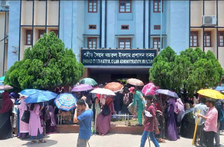 বুধবার ১৭ জুলাই বেলা পৌনে ১২ টার দিকে বিশ্ববিদ্যালয়ের সৈয়দ নজরুল ইসলাম প্রশাসন ভবনের সামনে অবস্থান নেয় শিক্ষার্থীরা।