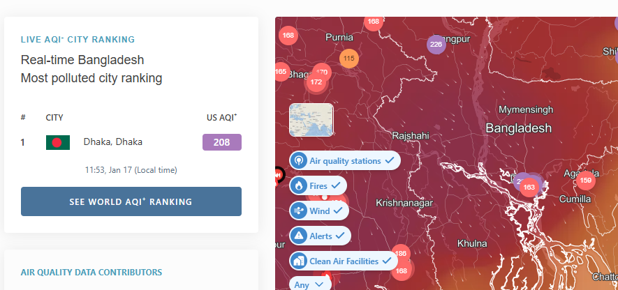 বিশ্বের দূষিত বাতাসের শহরগুলোর তালিকায় আবারও শীর্ষস্থানে উঠে এসেছে জনবহুল শহর ঢাকা। শুক্রবার ১৭ জানুয়ারি বেলা ১২টার দিকে একিউআই স্কোর ২০৮ নিয়ে তালিকার শীর্ষ স্থানে উঠে এসেছে রাজধানীটি।