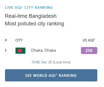 বাংলাদেশের ঘনবসতিপূর্ণ রাজধানী ঢাকা শুক্রবার ২০ ডিসেম্বর সকাল ১০টা ৪০ মিনিটে ২৫৯ একিউআই স্কোর  নিয়ে দূষিত বাতাসের শহরের তালিকায় দ্বিতীয় অবস্থানে রয়েছে। একিউআই সূচক অনুযায়ী, আজকের বাতাসকে ‘অত্যন্ত অস্বাস্থ্যকর’ হিসেবে শ্রেণিবদ্ধ করা হয়েছে।