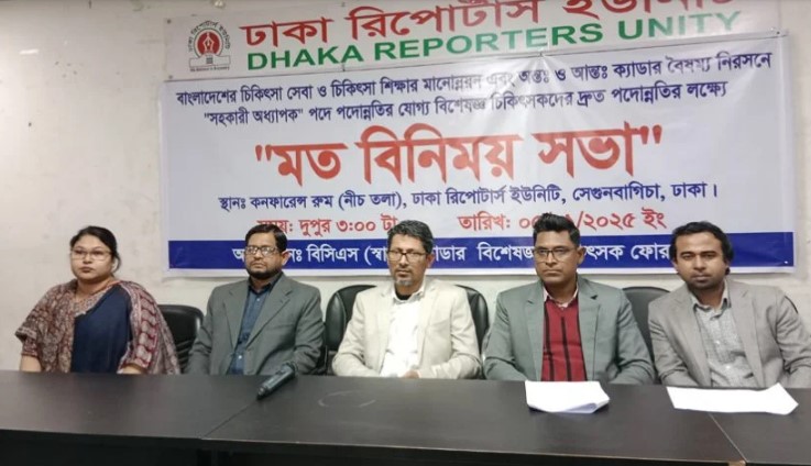 আজ রোববার বিকালে রাজধানীর ঢাকা রিপোর্টার্স ইউনিটিতে (ডিআরইউ) বাংলাদেশের চিকিৎসা সেবা ও চিকিৎসা শিক্ষার মানোন্নয়ন এবং অন্তঃ ও আন্তঃক্যাডার বৈষম্য নিরসনে সহকারী অধ্যাপক পদে পদোন্নতিতে যোগ্য বিশেষজ্ঞ চিকিৎসকদের দ্রুত পদোন্নতির লক্ষ্যে আয়োজিত এক মতবিনিয় সভায় এ দাবি জানিয়েছে সংগঠনটি।
