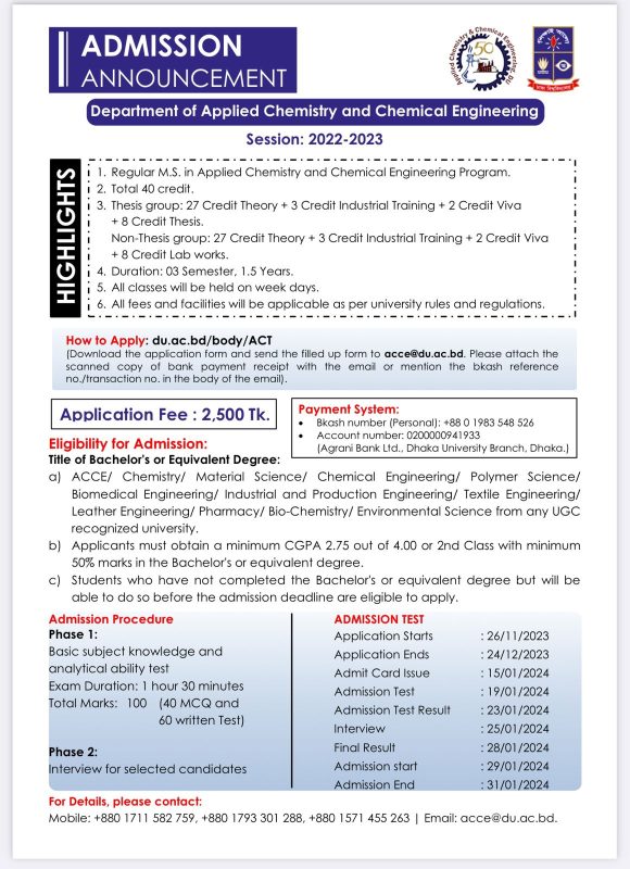 ঢাকা বিশ্ববিদ্যালয় অ্যাপ্লাইড কেমিস্ট্রি অ্যান্ড কেমিক্যাল ইঞ্জিনিয়ারিং বিভাগ ২০২২-২৩ সেশনে ভর্তির বিজ্ঞপ্তি দেওয়া হয়েছে।