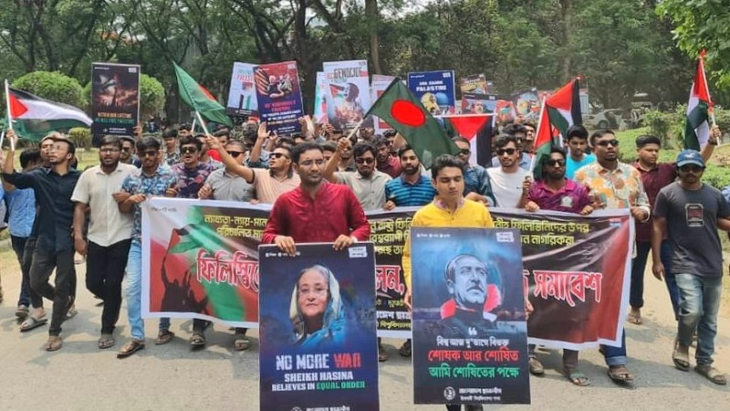 সোমবার (৬ মে) সকাল সাড়ে ১১টার দিকে বিশ্ববিদ্যালয় শাখা ছাত্রলীগের দলীয় ট্রেন্ট থেকে পদযাত্রা শুরু হয়। পদযাত্রা ও ছাত্র সমাবেশে ফিলিস্তিনের পতাকা উত্তোলন করেন শাখা ছাত্রলীগের নেতাকর্মীরা।