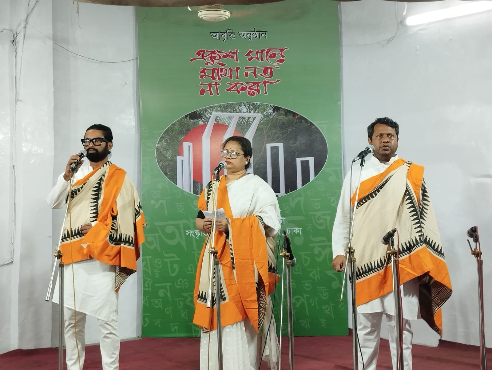 আবৃত্তিশিল্পী রফিকুল ইসলামের সূচনা বক্তব্যের মধ্য দিয়ে ‘একুশ মানে মাথা নত না করা’ শীর্ষক অনুষ্ঠান শুরু হয়। অনুষ্ঠানের প্রথম দিনে উল্লেখযোগ্য সংখ্যক শিশু কিশোর ও আবৃত্তিশিল্পীদের অংশগ্রহণে সকলে মিলে একুশের চেতনা সমুন্নত রাখার প্রত্যয় ব্যক্ত করা হয়।