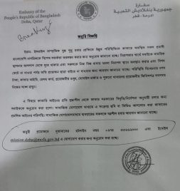 ইরান-ইসরায়েল সাম্প্রতিক যুদ্ধের প্রেক্ষাপটে উদ্ভূত পরিস্থিতিতে কাতারে অবস্থানরত প্রবাসী বাংলাদেশিদের বিশেষ সতর্কতা অবলম্বনের আহ্বান জানিয়েছে।