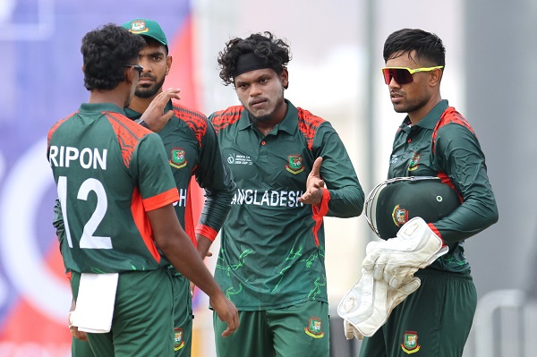 বাংলাদেশের হয়ে রিপন মণ্ডল ৪ ওভারে ২৪ রানে ৪ উইকেট নেন। একটি করে উইকেট নেন আবু হায়দার, রেজাউর রহমান, রাকিবুল হাসান ও মাহফুজুর রহমান রাব্বী।
