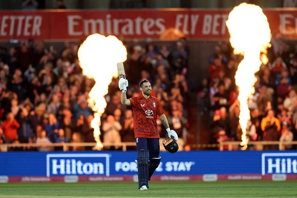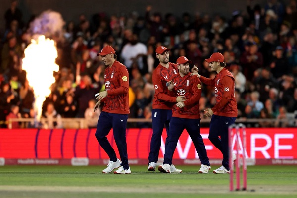 ম্যানচেস্টারে প্রথমে ব্যাটে এসে ৮ ওভারে ১২৬ রানের ওপেনিং জুটি গড়েন জস বাটলার ও ফিল সল্ট। বাটলার ৩০ বলে খেলেন ৮৩ রানের ইনিংস। দ্বিতীয় উইকেটের জুটিতে আসে আরো ৯৫ রান। তাতেই রানের পাহাড়ের দিকে এগিয়ে যায় ইংল্যান্ড। সঙ্গে হ্যারি ব্রুকের অপরাজিত ৪১। সল্টের অপরাজিত ৬০ বলে ১৪১। দুই উইকেটে ইংলিশদের বিশাল সংগ্রহ।