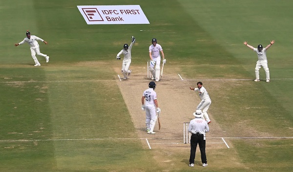 জবাবে নেমে খুব একটা ভালো হয়নি স্টোকসদের প্রথম ইনিংস, ২৫৩ রানে অলআউট হয় ইংল্যান্ড। সর্বোচ্চ ৭৬ রান আসে ওপেনার জ্যাক ক্রলির ব্যাট থেকে। এছাড়া অধিনায়ক বেন স্টোকস করেন দ্বিতীয় সর্বোচ্চ ৪৭ রান। বাকিদের আসা-যাওয়ায় প্রথম ইনিংসে ১৪৩ রানে এগিয়ে যায় ভারত। ডানহাতি পেসার জাসপ্রীত বুমরাহ নেন ৬ উইকেট। এছাড়া কুলদীপ যাদব ৩টি এবং অক্ষর প্যাটেল নেন একটি উইকেট।