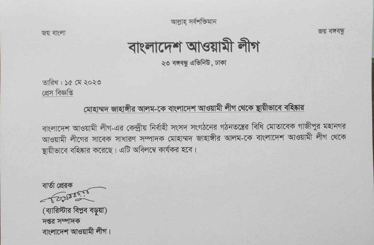 গাজীপুর মহানগর আওয়ামী লীগের সাবেক সাধারণ সম্পাদক মোহাম্মদ জাহাঙ্গীর আলমকে আওয়ামী লীগ থেকে স্থায়ীভাবে বহিষ্কার করা হয়েছে।