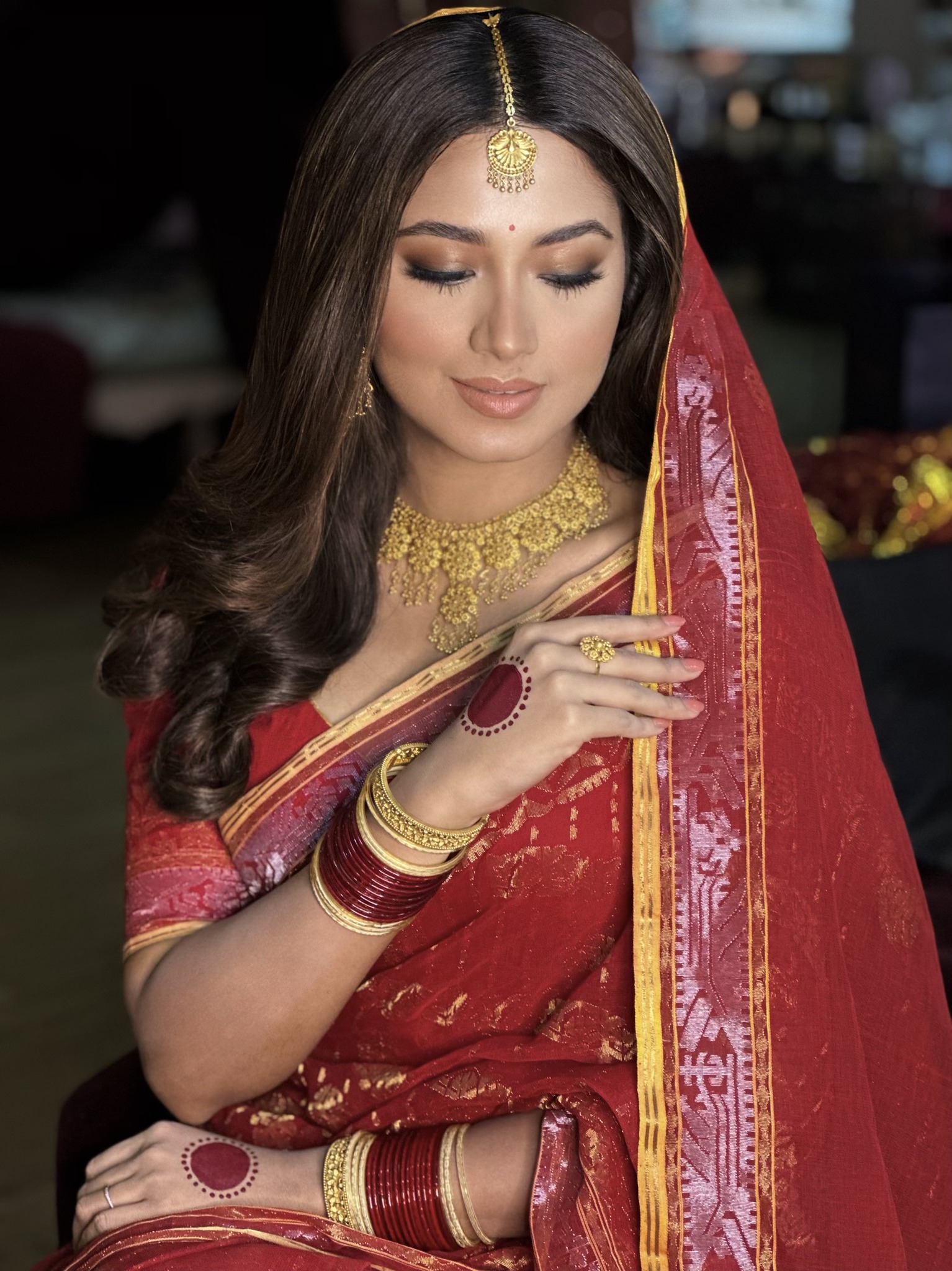 ফারিণের শেয়ার করা ছবিতে তাকে দেখা যায় পুরো কনে সাজেই! লাল জামদানি শাড়ির পাশাপাশি চুড়ি আর টিকলিতে দারুণ ফারিণ, কিন্তু বরের মুখাবয়ব দেখা যায়নি।