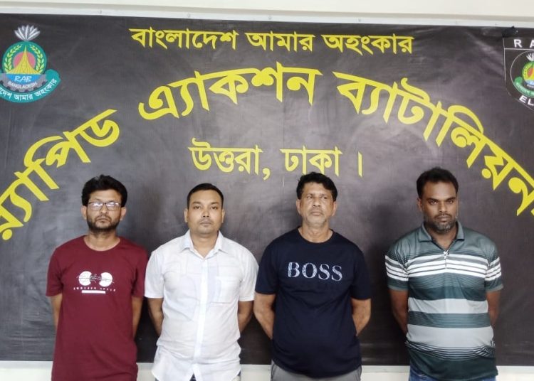 আটকেরা হলেন, মো. গোলাম মাওলা কায়েছ (৫৭), মো. নাসিম রেজা (৩০), মো. আবুল কালাম আজাদ (৪০), মো. পিয়ার হোসেন (৪২)।